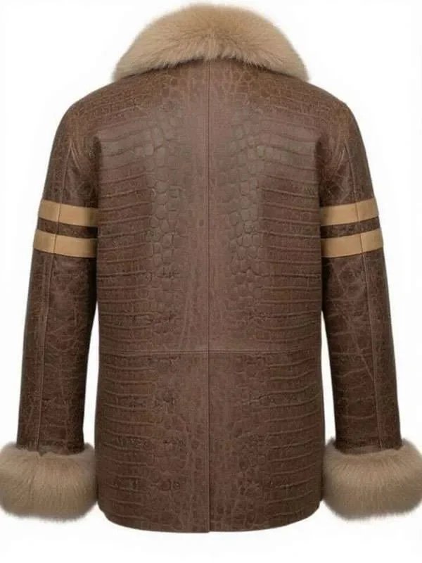 The exterior features a unique all-over embossed pattern reminiscent of exotic textures, providing a rich, multi-dimensional look. For ultimate warmth, the coat is adorned with a thick, plush faux fur collar and matching cuffs in a warm tan shade. The front is secured by traditional nautical-inspired toggle closures with thick rope detailing, adding a vintage touch to the modern silhouette. Finished with horizontal tan stripe accents on the sleeves, this jacket offers a tailored yet adventurous aesthetic.