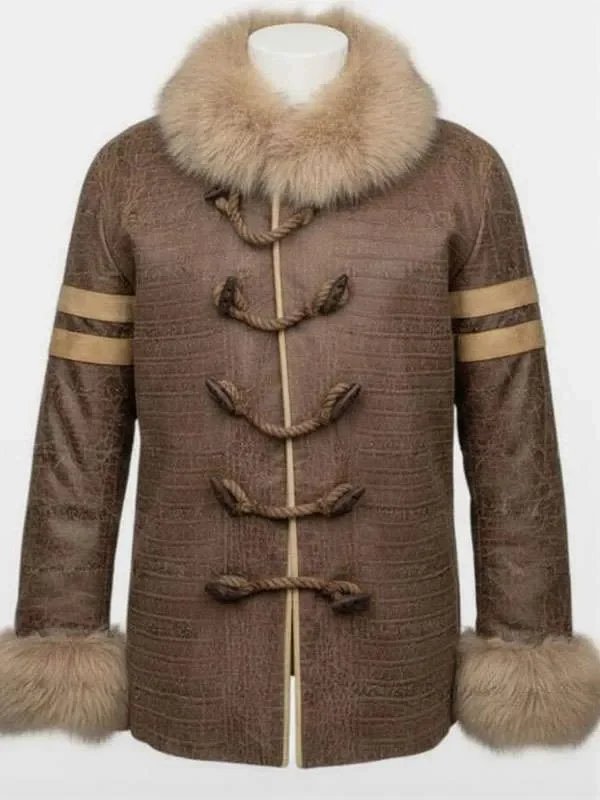 Men’s Brown Embossed Toggle Coat | Faux Fur Trim Winter Jacket