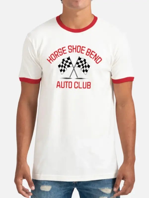 - Signature Graphic: Features the iconic “Horse Shoe Bend Auto Club” logo with crossed checkered flags for a vintage racing aesthetic.